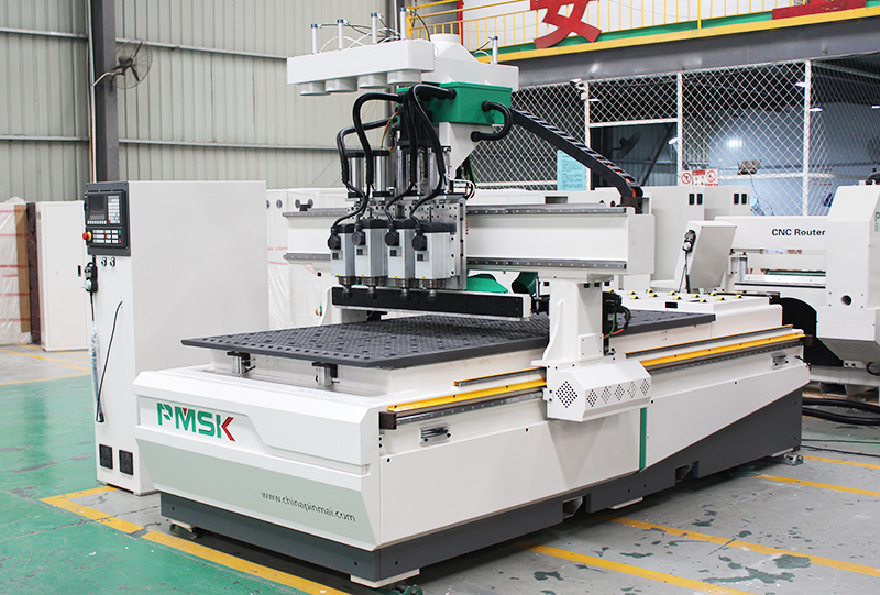 ?3.三工序數控開料機,這是定制家具廠使用數控開料入門級的的機型,機器有三個主軸,三個主軸都是6KW風冷的,機器在加工板件的時候一個主軸裝φ6刀開槽,一個主軸裝φ8刀專門開料,第三個主軸裝φ6刀用來加工所有的孔位,包括φ8,φ10,φ15的孔。此款機型在2017年以后就沒有再生產,主要是因為三工序開料機打孔,所有的孔都是用φ6刀銑出來的,機器時間長了會出現精度誤差,從而造成銑孔不圓的情況。